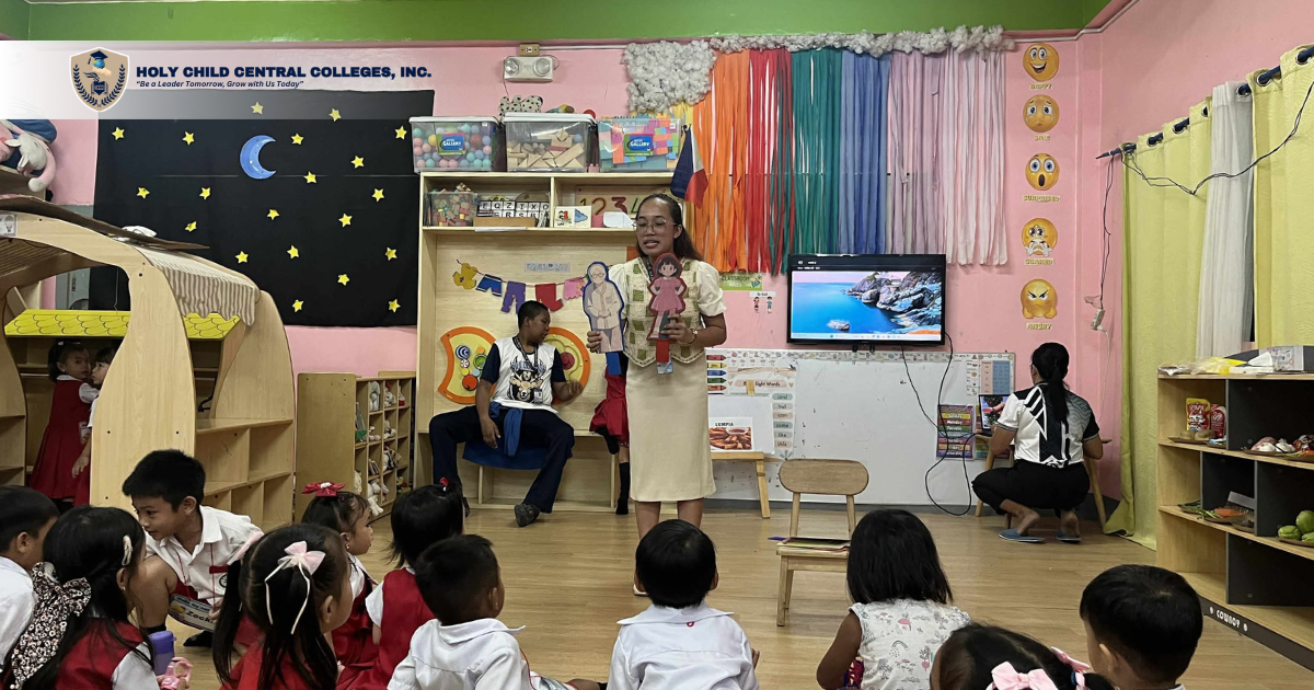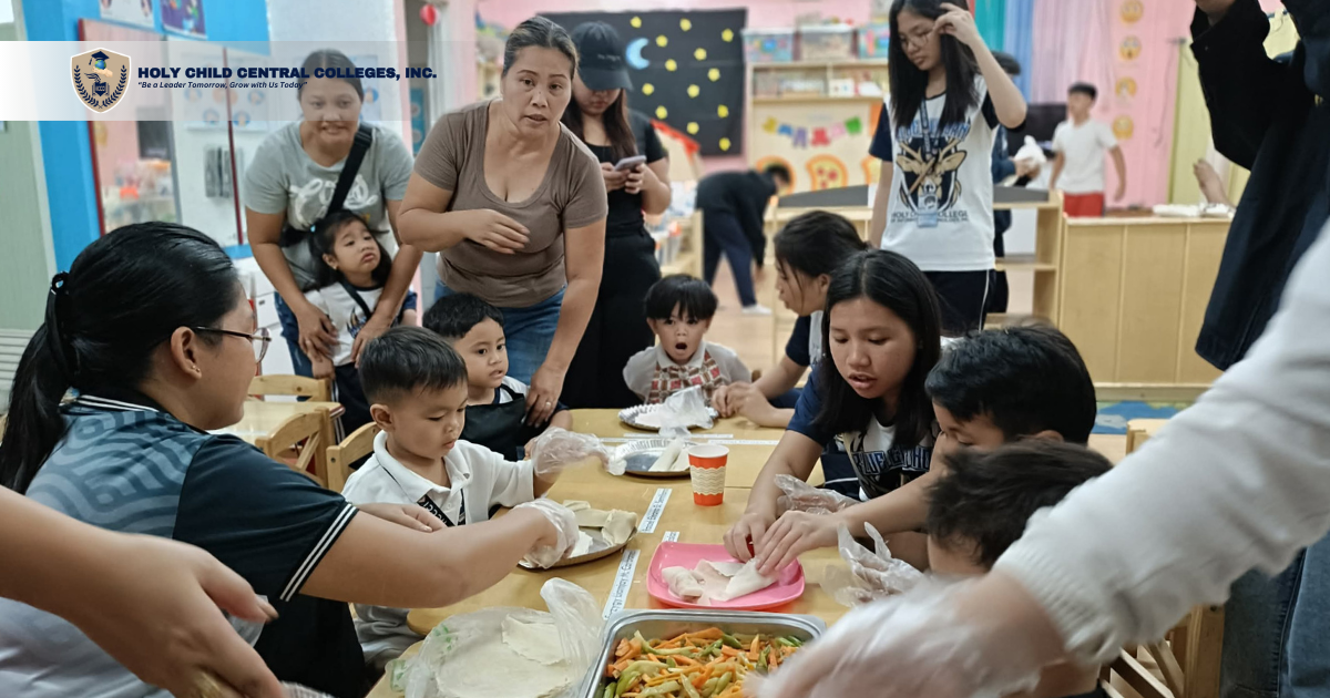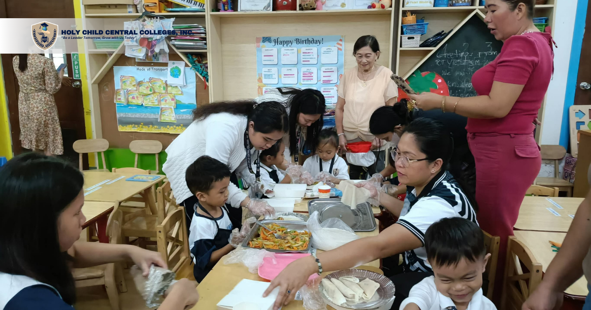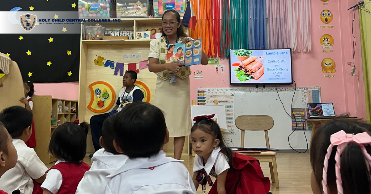 The morning began with Ms. Joy D. Jordan, LPT, Kindergarten teacher of the HCCCI Basic Education Department, who guided the children through introductory exercises and interactive warm-ups. This was followed by storytelling sessions led by Claris Parcon Anating, a Bachelor of Early Childhood Education first-year student of HCCCI, who narrated Lumpia Lane by Caitlin C. Wu and Grace D. Chong. Additional storytellers Arnelyn B. Antonio and Jeaneva P. Dela Rosa also enriched the program with narratives that introduced Filipino values such as kindness, responsibility, discipline, and respect.