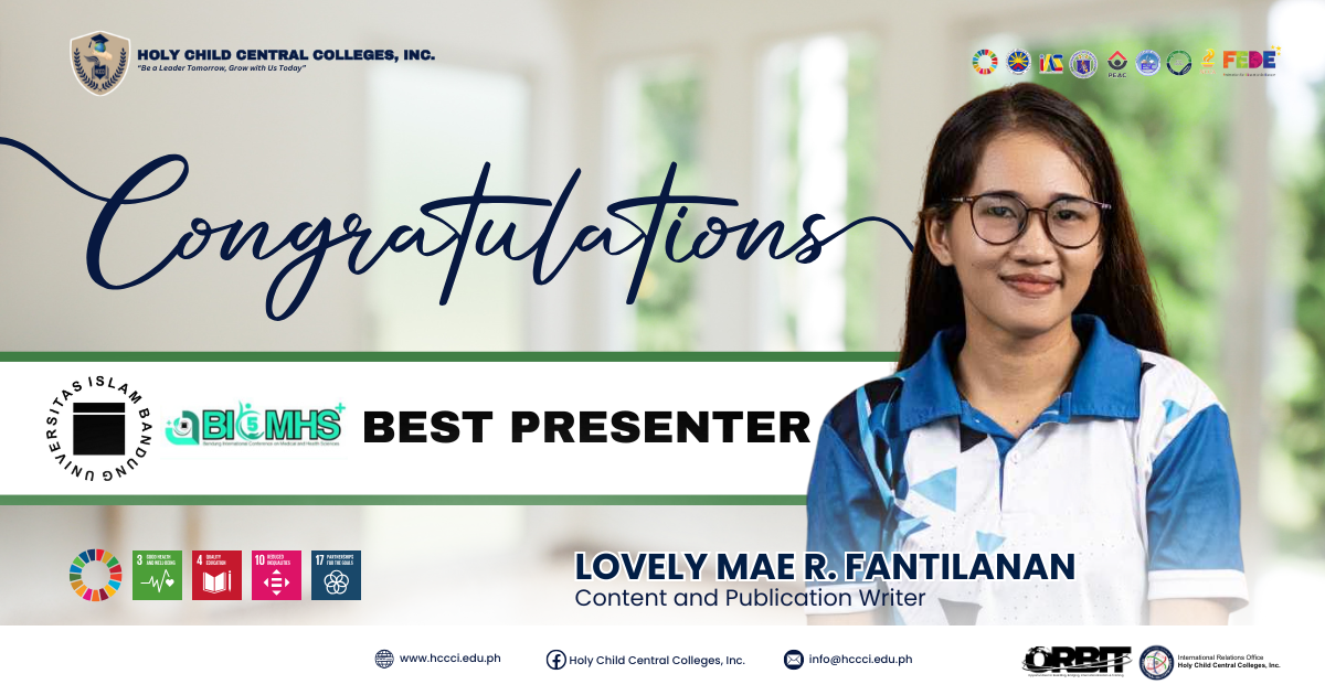 Representing HCCCI in this international endeavor was Lovely Mae R. Fantilanan, Content and Publication Writer of HCCCI. Her participation brought great pride to the institution as she shared her study before an international audience of academics and health professionalsโearning recognition as one of the Best Oral Presenters.